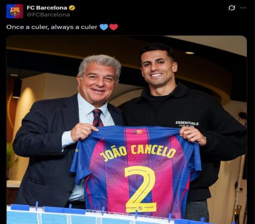 体育播报1月14日宣 若昂·坎塞洛重返巴塞罗那,渴望再次为球队赢得荣誉。这位葡萄牙国脚带着更大的热情和期待回到了他从未停止关注和支持的俱乐部。